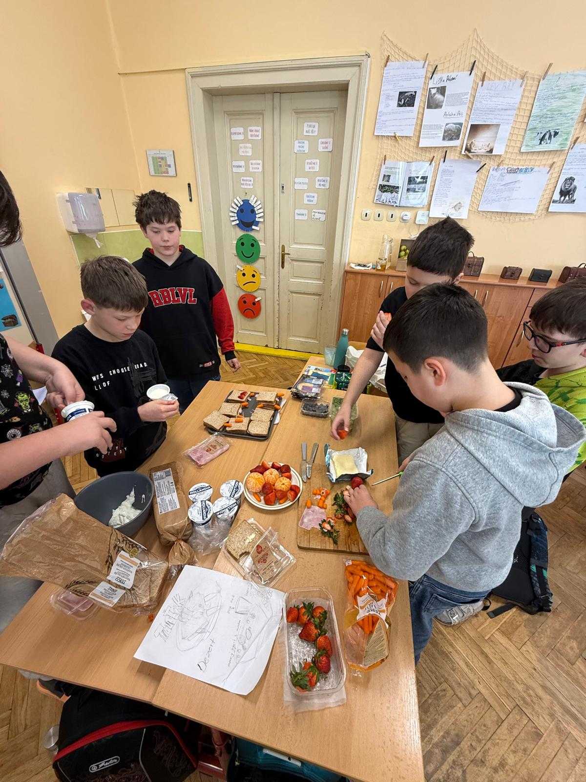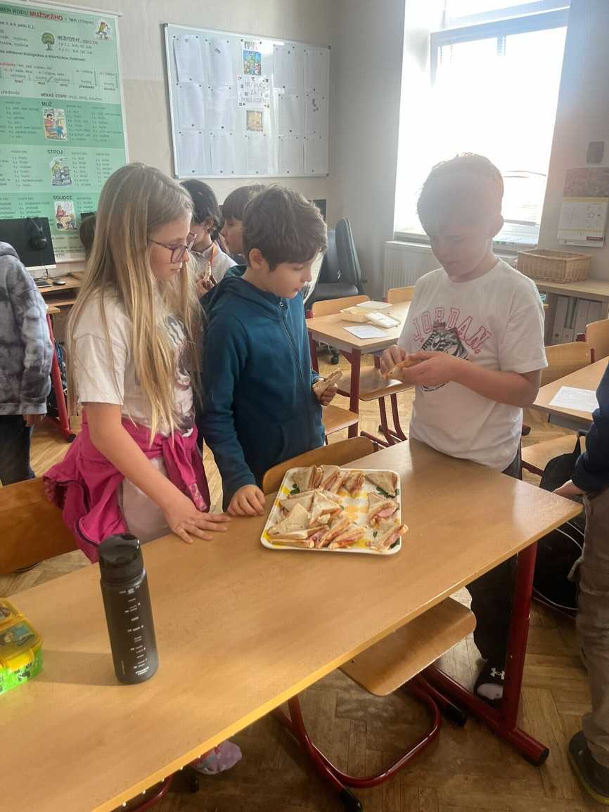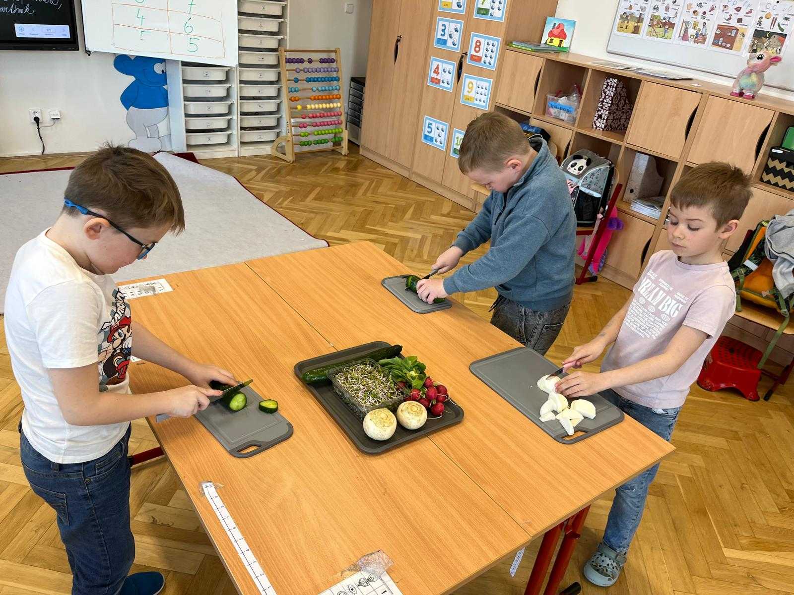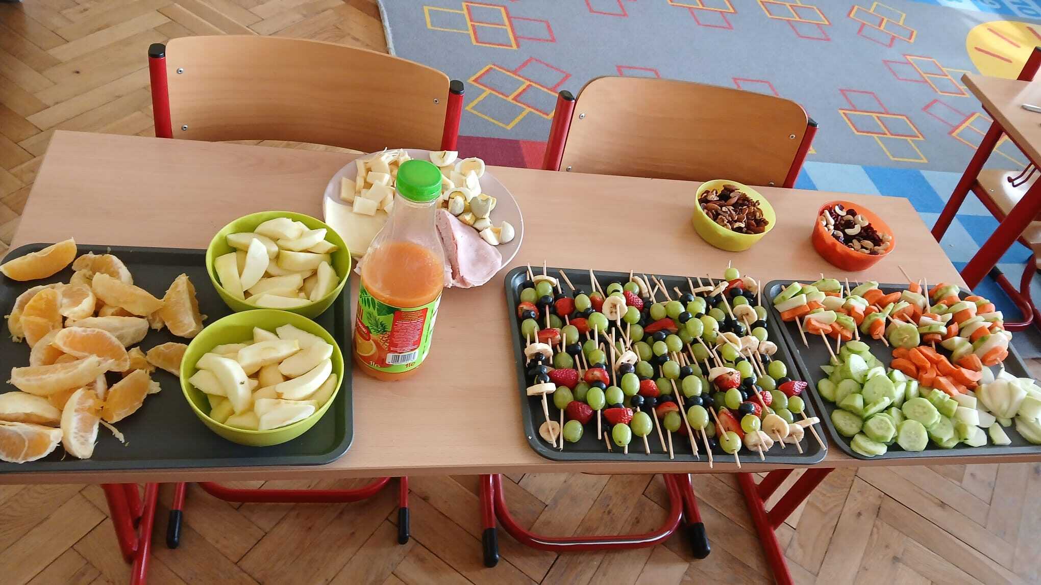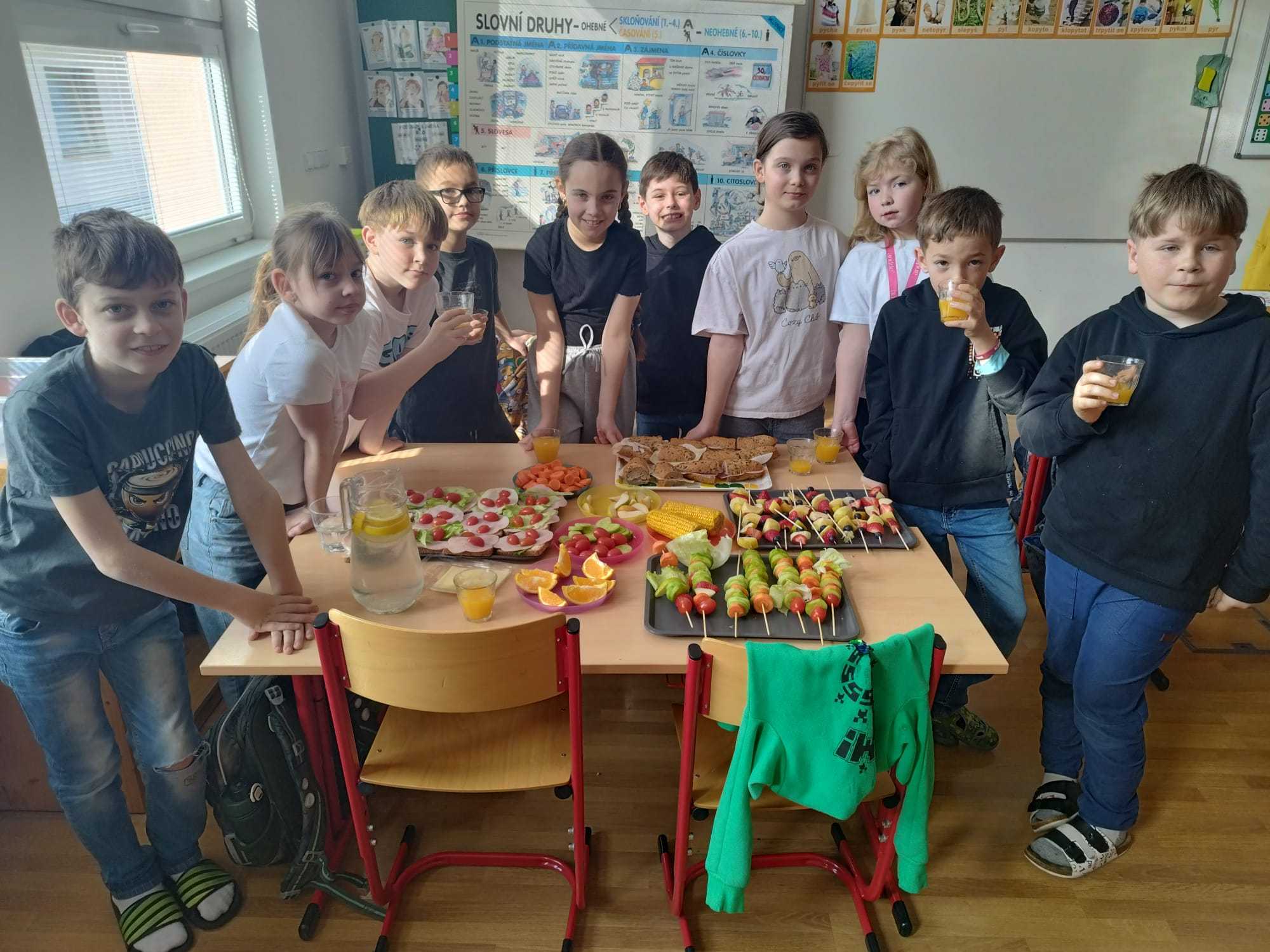 V jednotlivých třídách tomu bylo nejinak. Starší děti si nakoupily suroviny a připravily pro své spolužáky zdravou svačinku. Mladší děti hlavně zdokonalovaly krájecí, loupací a aranžovací dovednosti a připravily si švédské stoly, kde si každý mohl vybrat, co mu chutná.