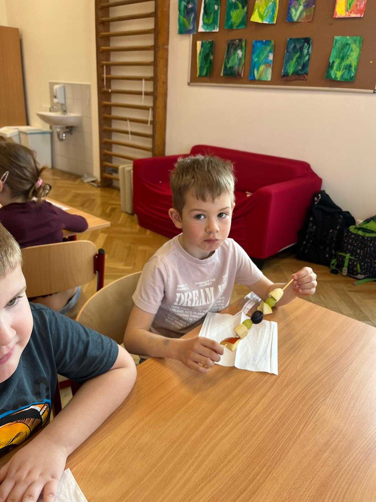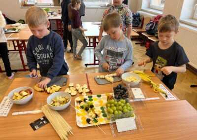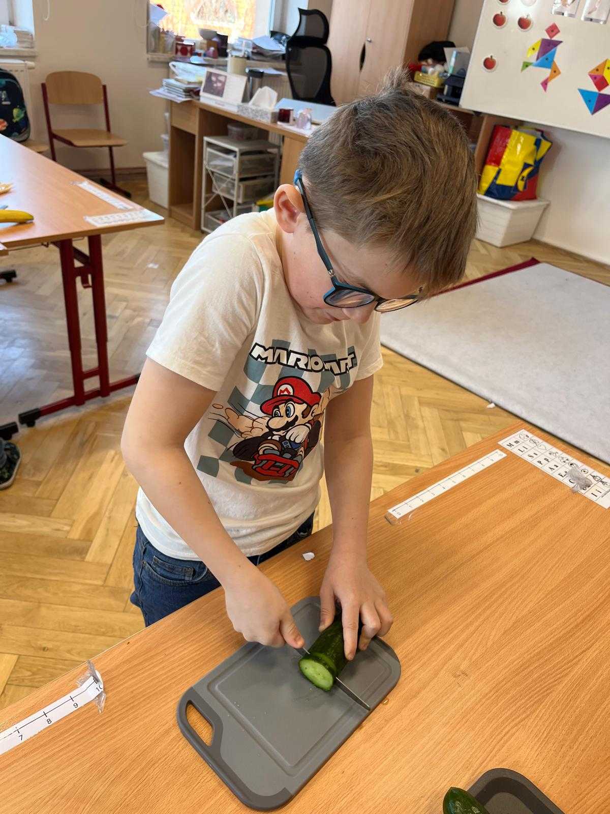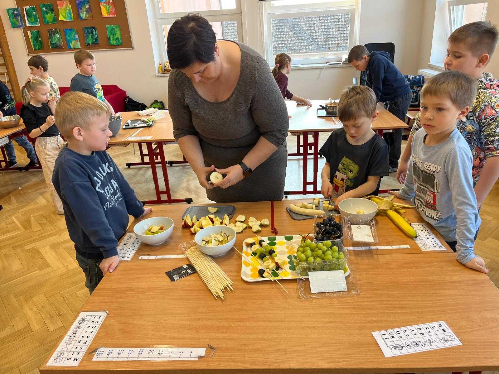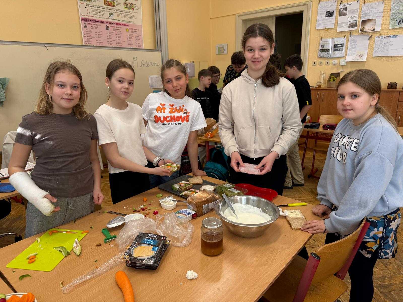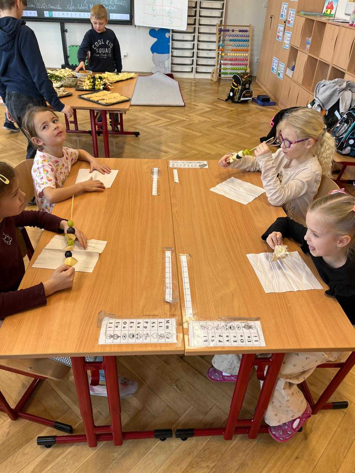 V jednotlivých třídách tomu bylo nejinak. Starší děti si nakoupily suroviny a připravily pro své spolužáky zdravou svačinku. Mladší děti hlavně zdokonalovaly krájecí, loupací a aranžovací dovednosti a připravily si švédské stoly, kde si každý mohl vybrat, co mu chutná.
