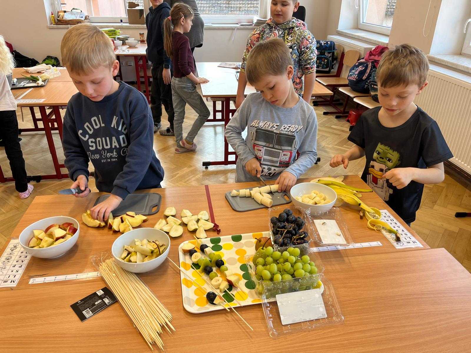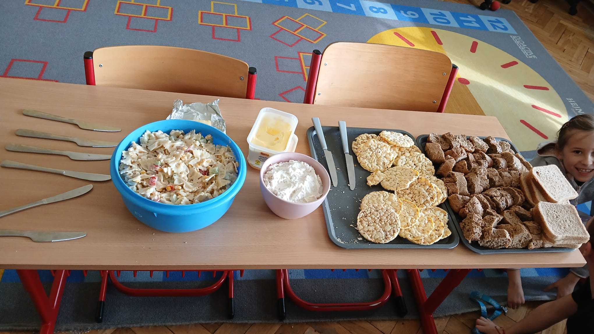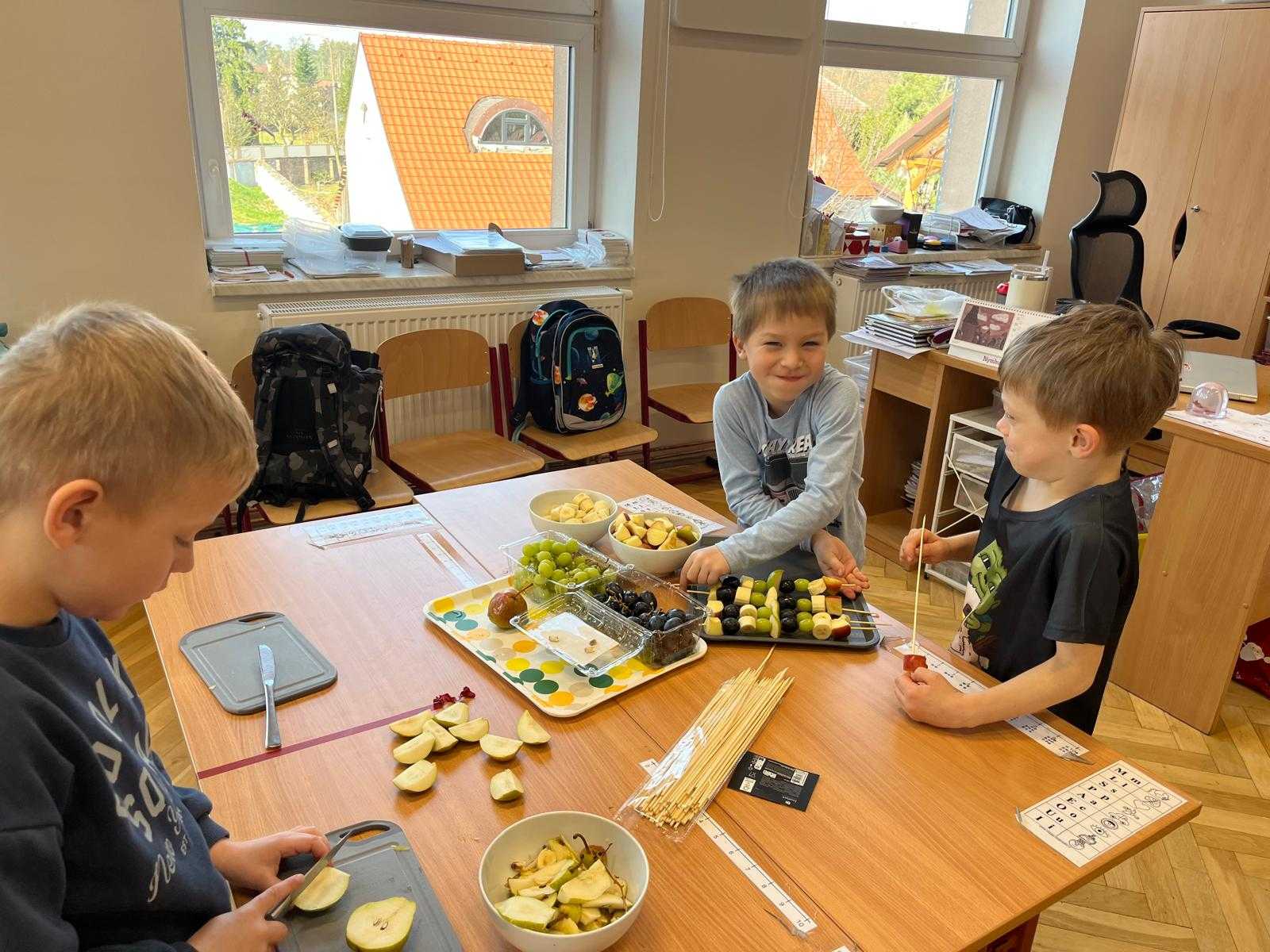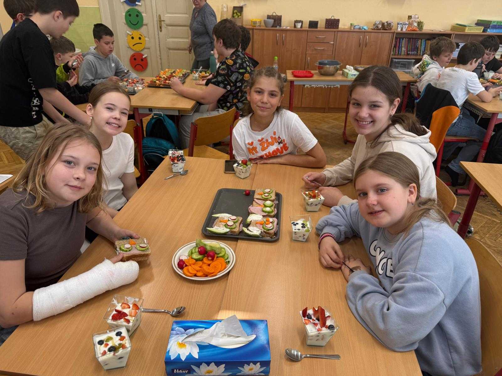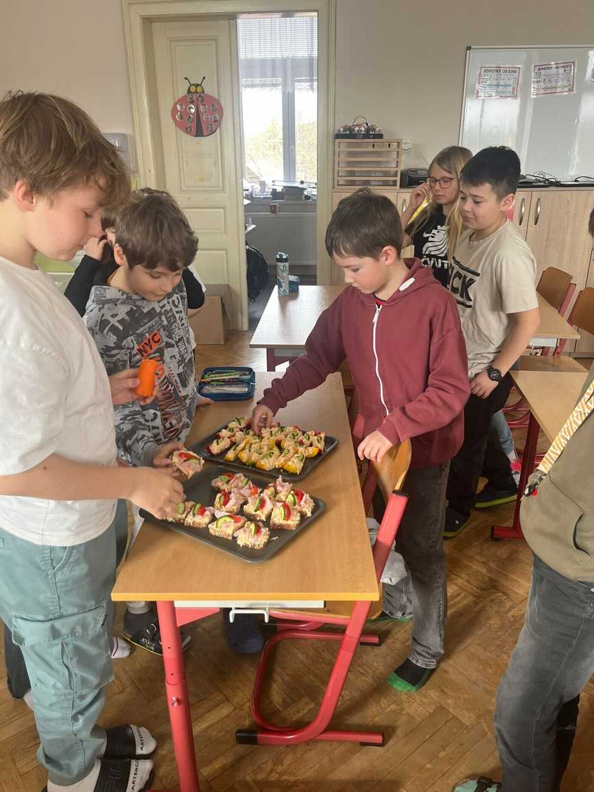 V jednotlivých třídách tomu bylo nejinak. Starší děti si nakoupily suroviny a připravily pro své spolužáky zdravou svačinku. Mladší děti hlavně zdokonalovaly krájecí, loupací a aranžovací dovednosti a připravily si švédské stoly, kde si každý mohl vybrat, co mu chutná.