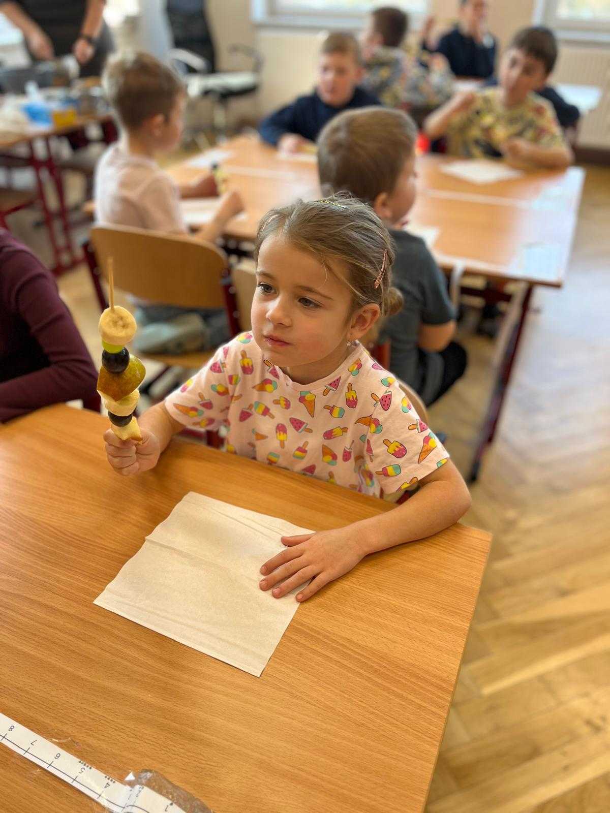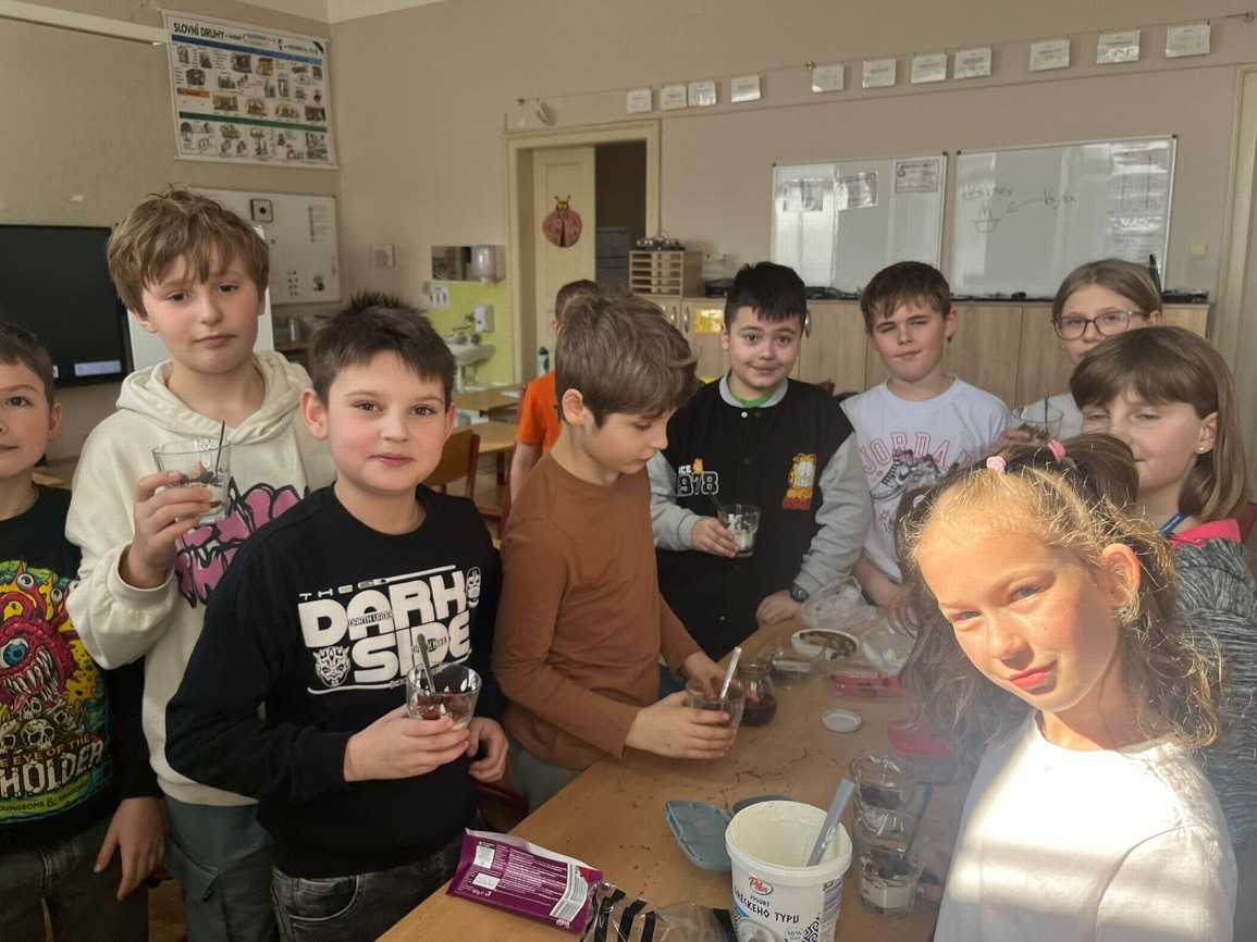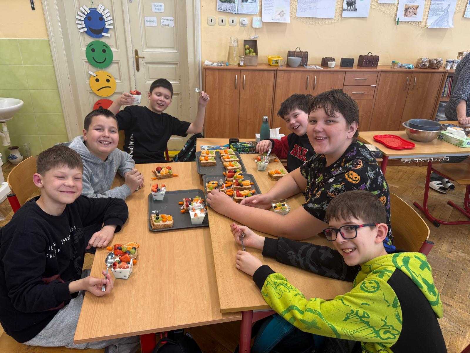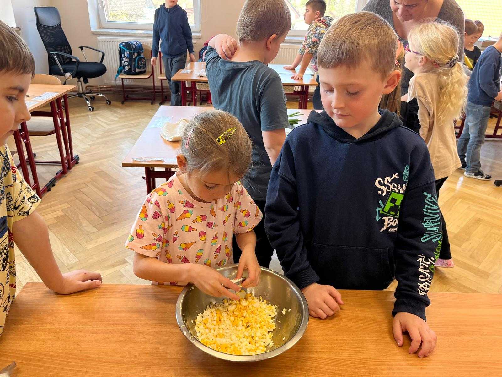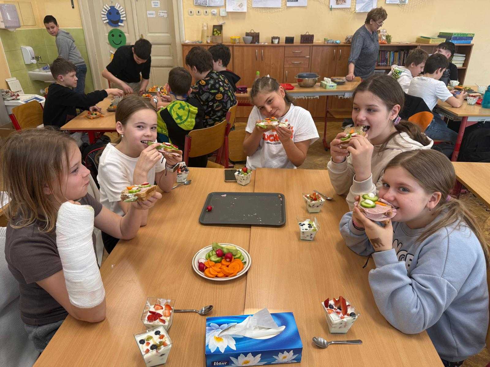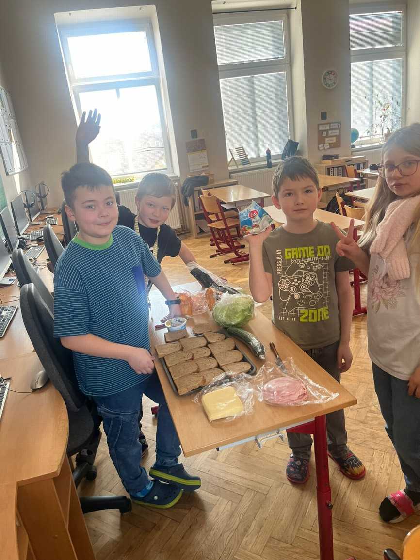 V jednotlivých třídách tomu bylo nejinak. Starší děti si nakoupily suroviny a připravily pro své spolužáky zdravou svačinku. Mladší děti hlavně zdokonalovaly krájecí, loupací a aranžovací dovednosti a připravily si švédské stoly, kde si každý mohl vybrat, co mu chutná.
