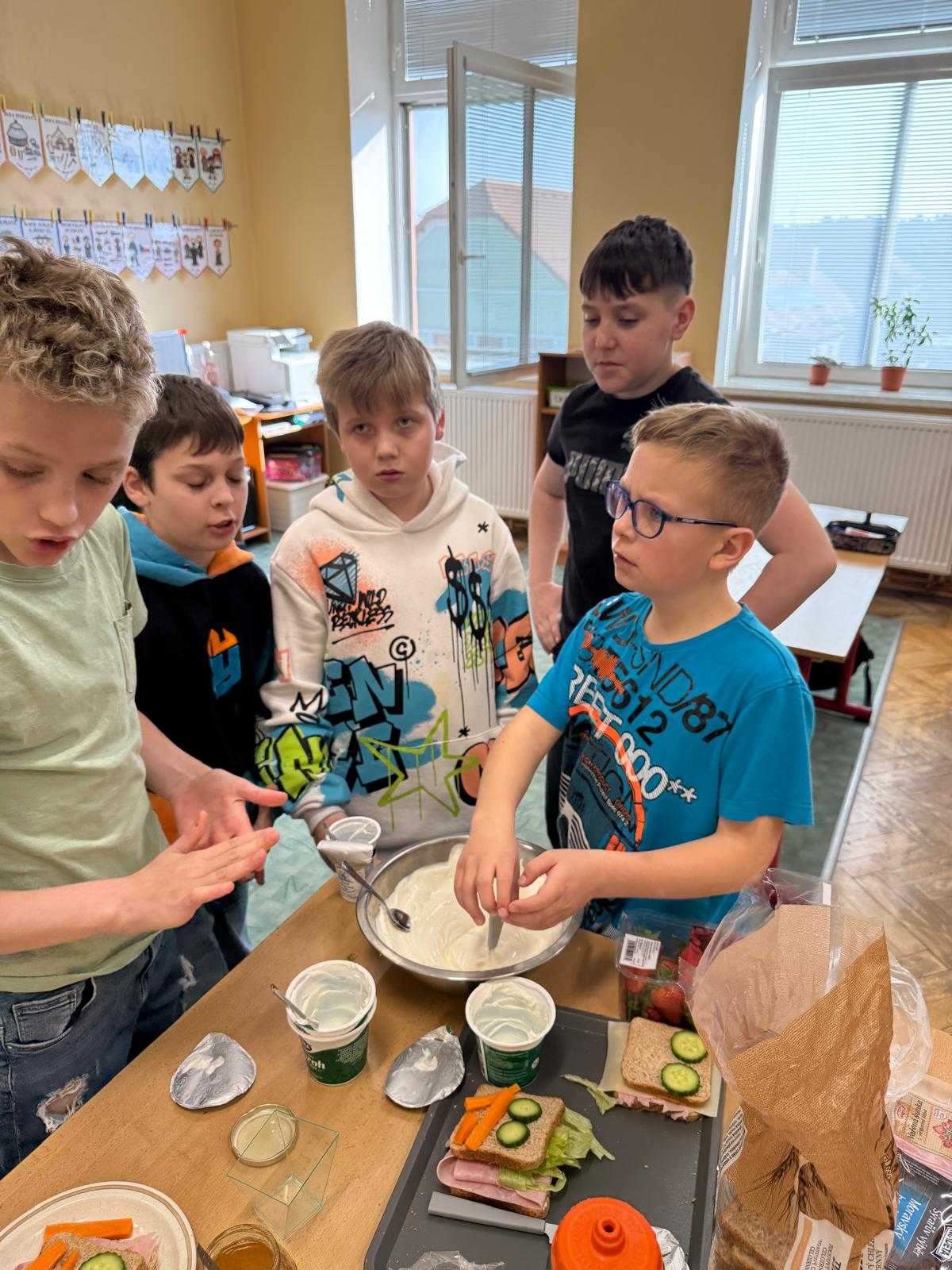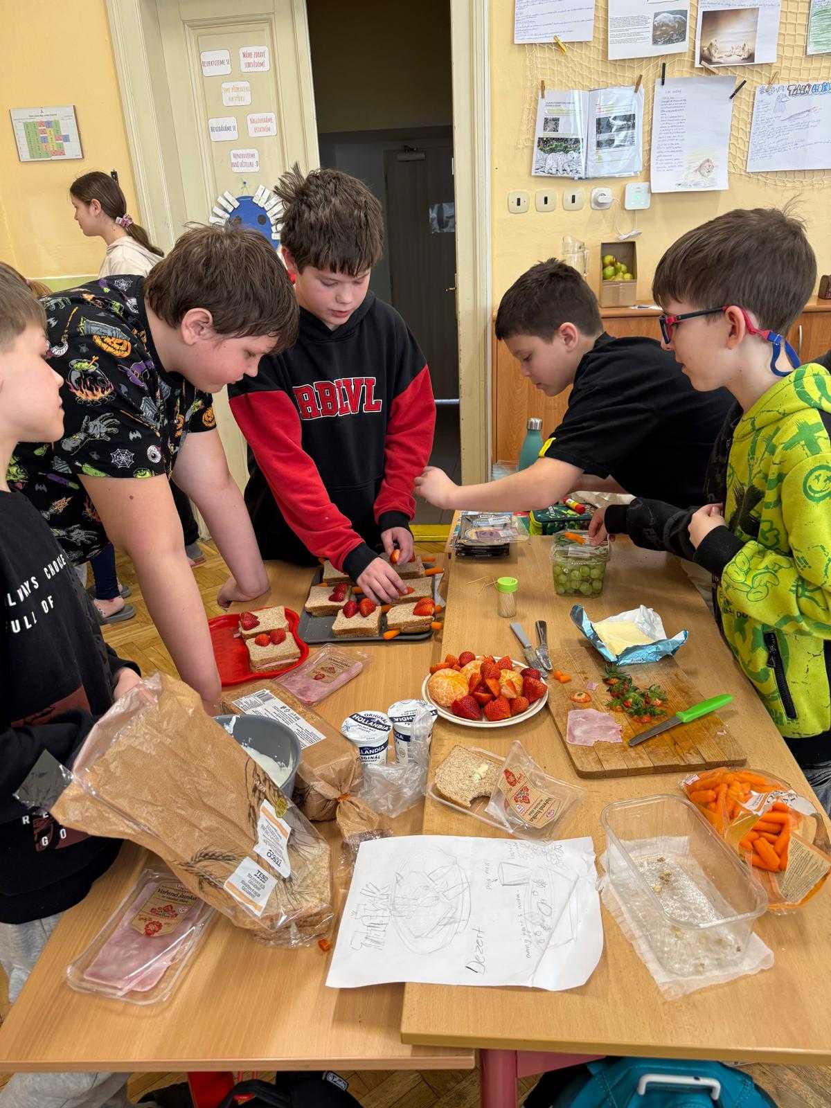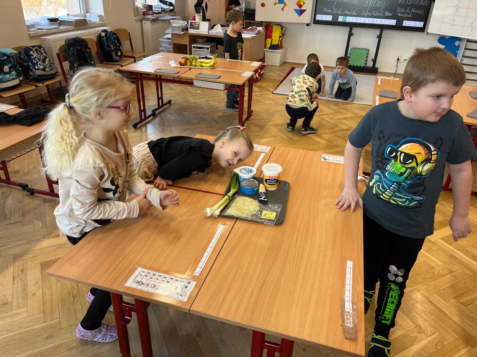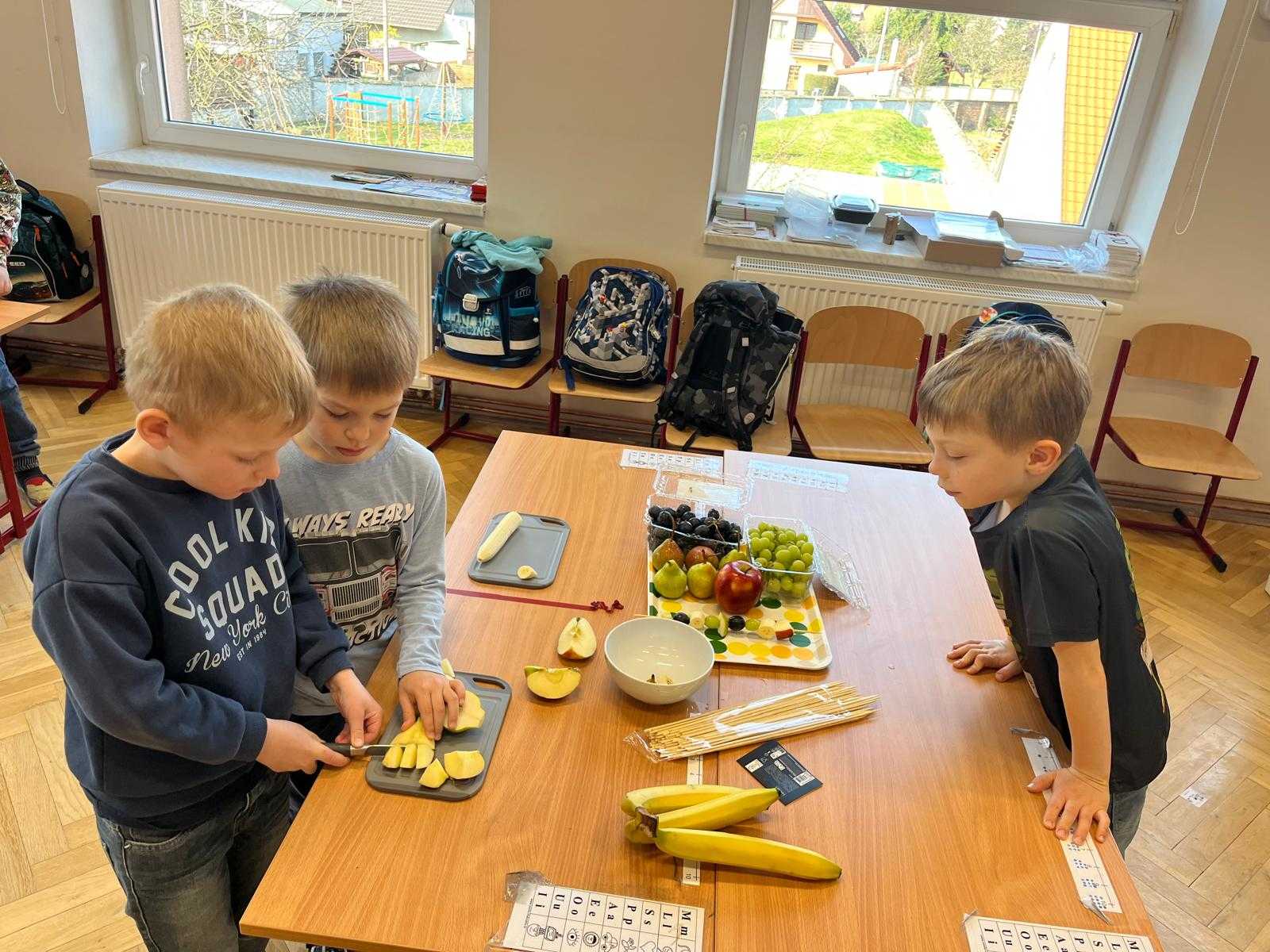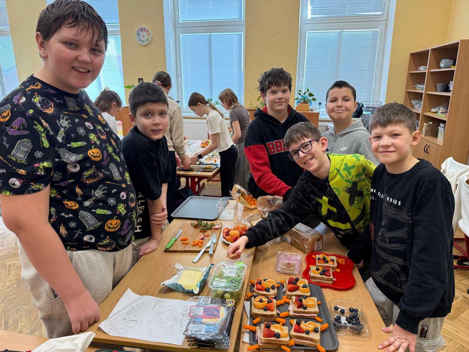 V jednotlivých třídách tomu bylo nejinak. Starší děti si nakoupily suroviny a připravily pro své spolužáky zdravou svačinku. Mladší děti hlavně zdokonalovaly krájecí, loupací a aranžovací dovednosti a připravily si švédské stoly, kde si každý mohl vybrat, co mu chutná.