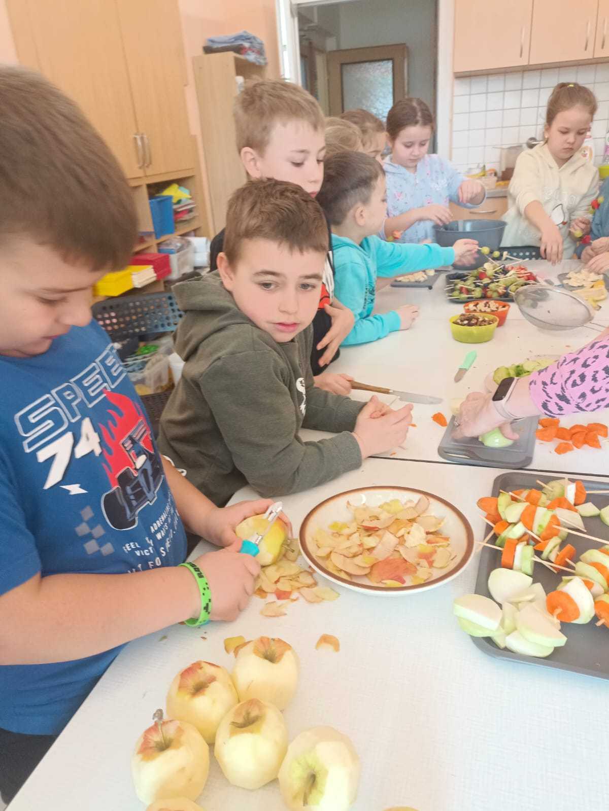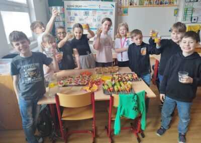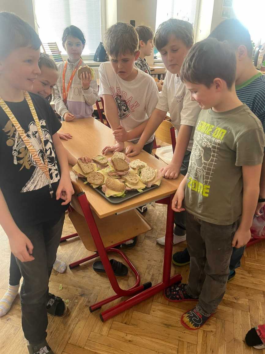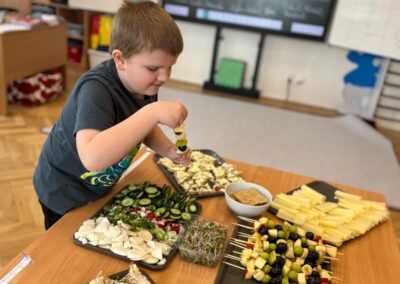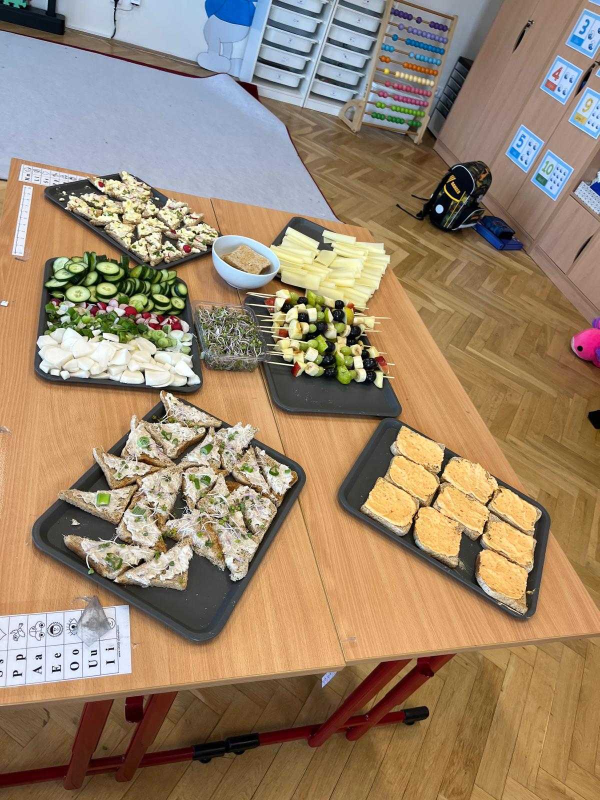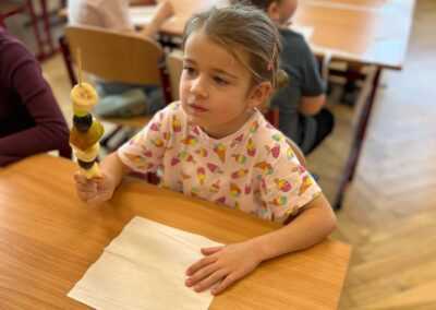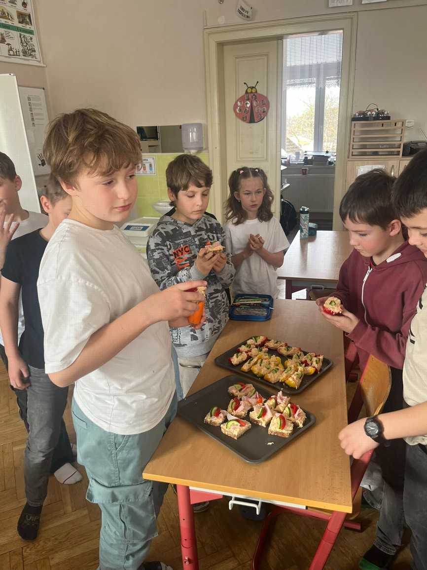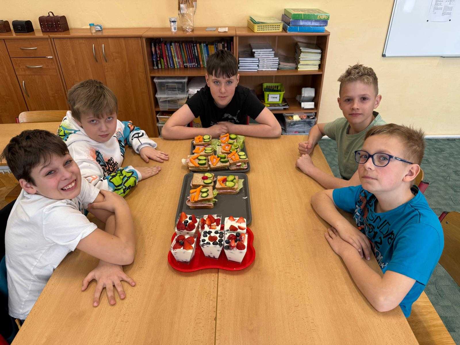 V jednotlivých třídách tomu bylo nejinak. Starší děti si nakoupily suroviny a připravily pro své spolužáky zdravou svačinku. Mladší děti hlavně zdokonalovaly krájecí, loupací a aranžovací dovednosti a připravily si švédské stoly, kde si každý mohl vybrat, co mu chutná.