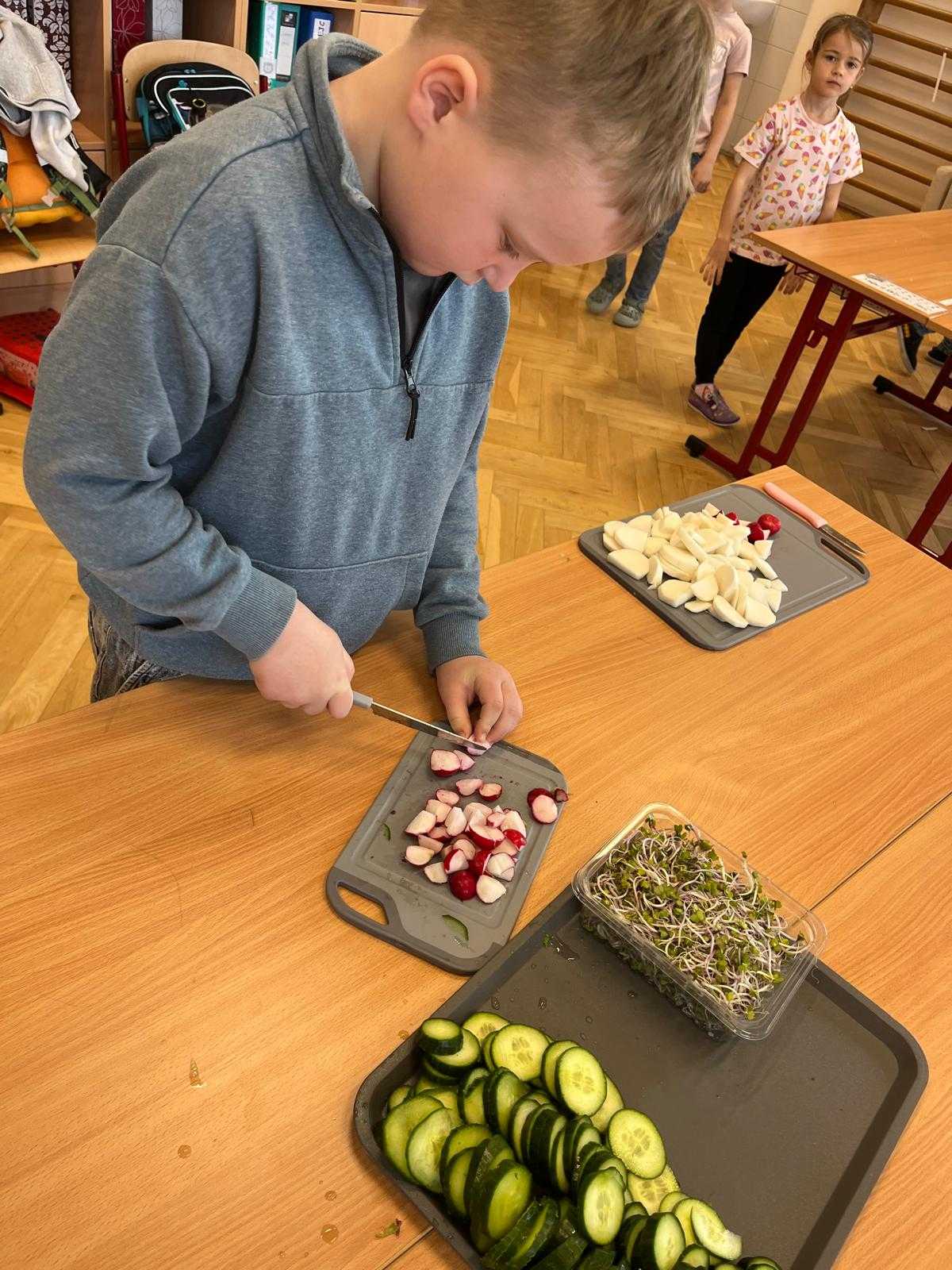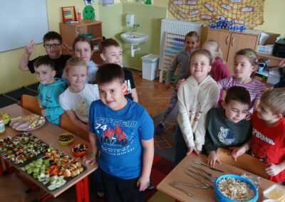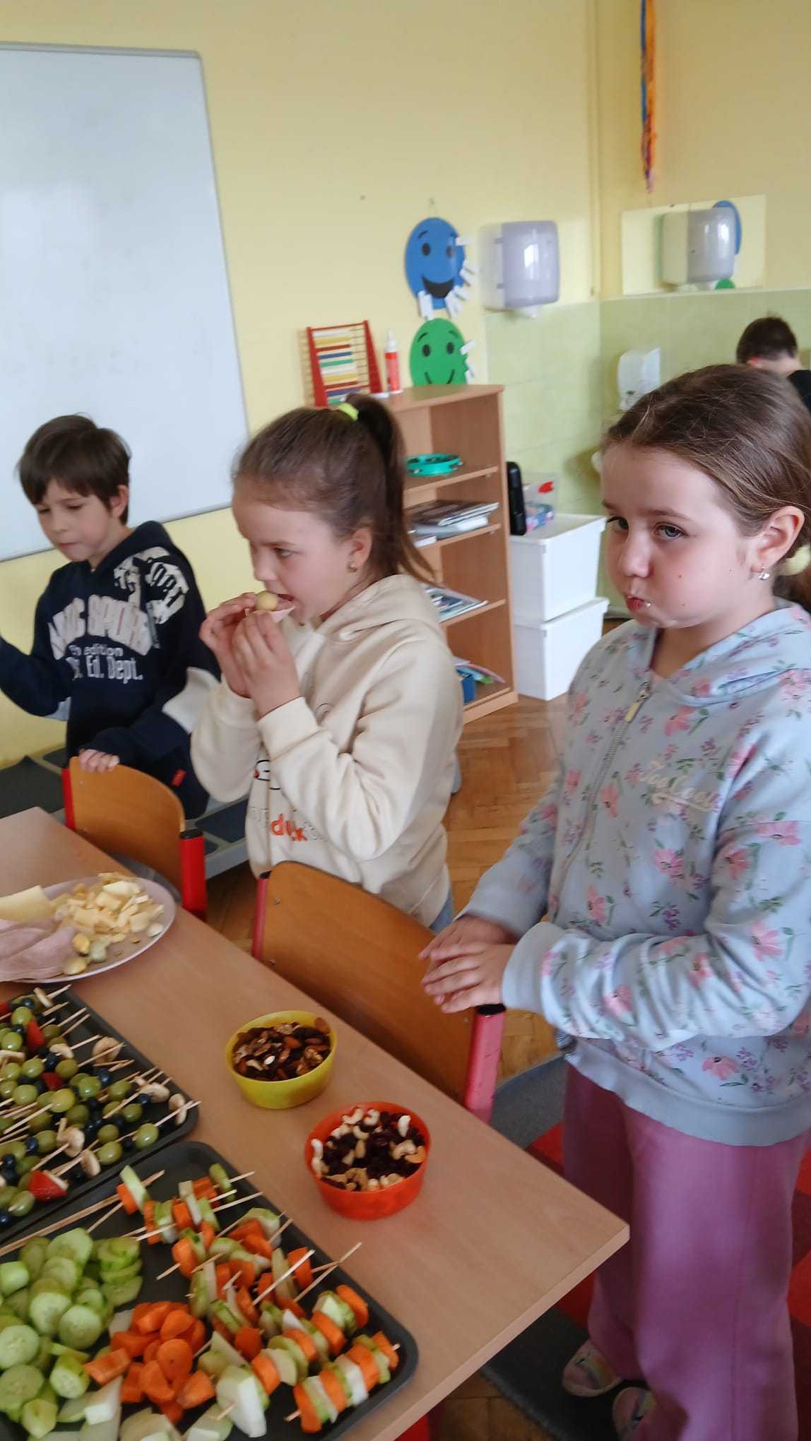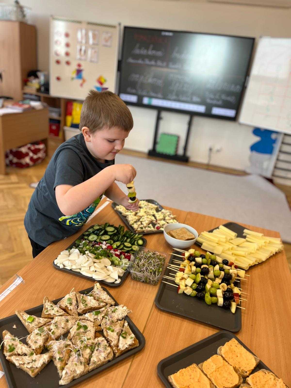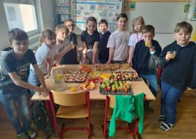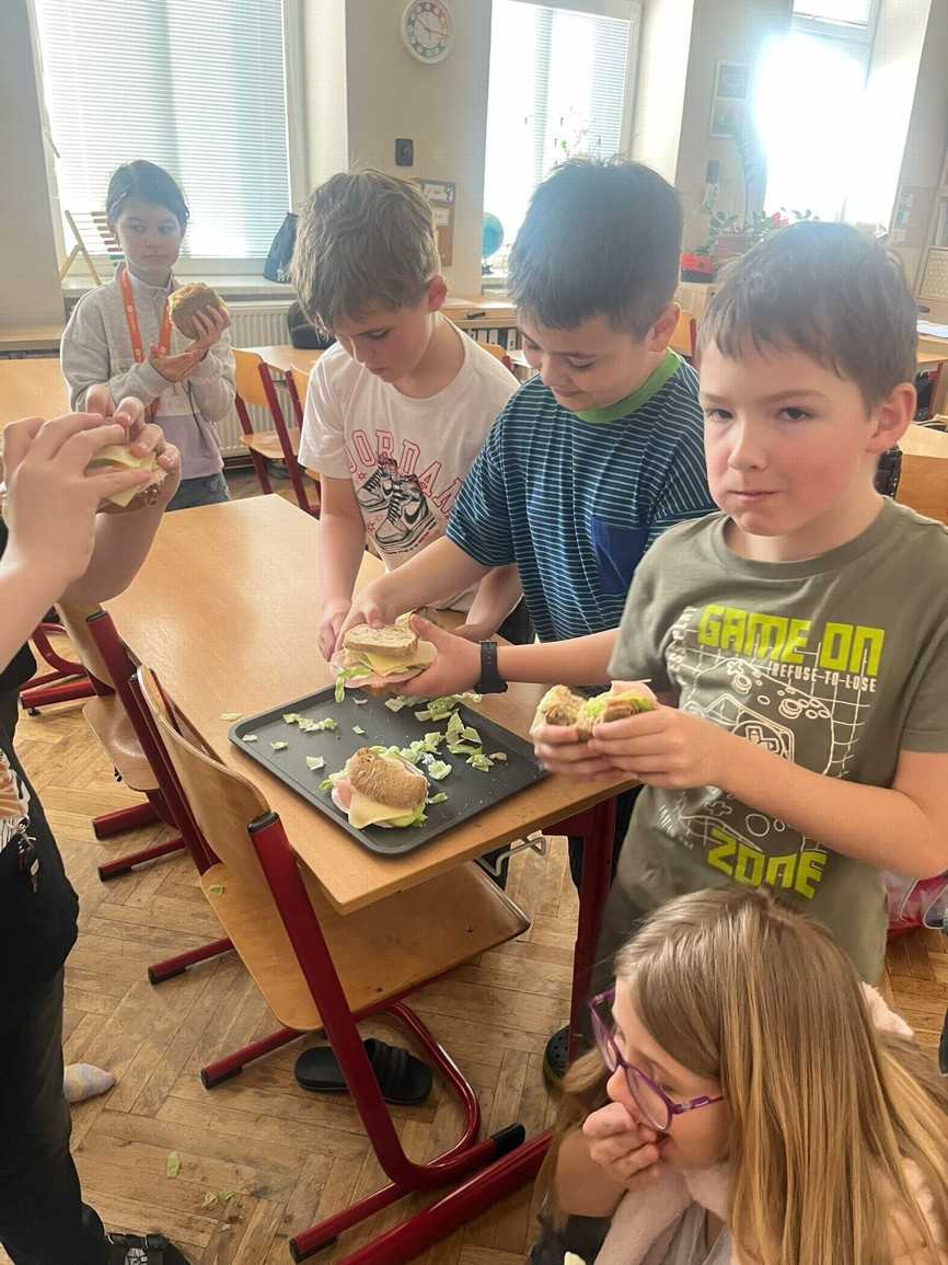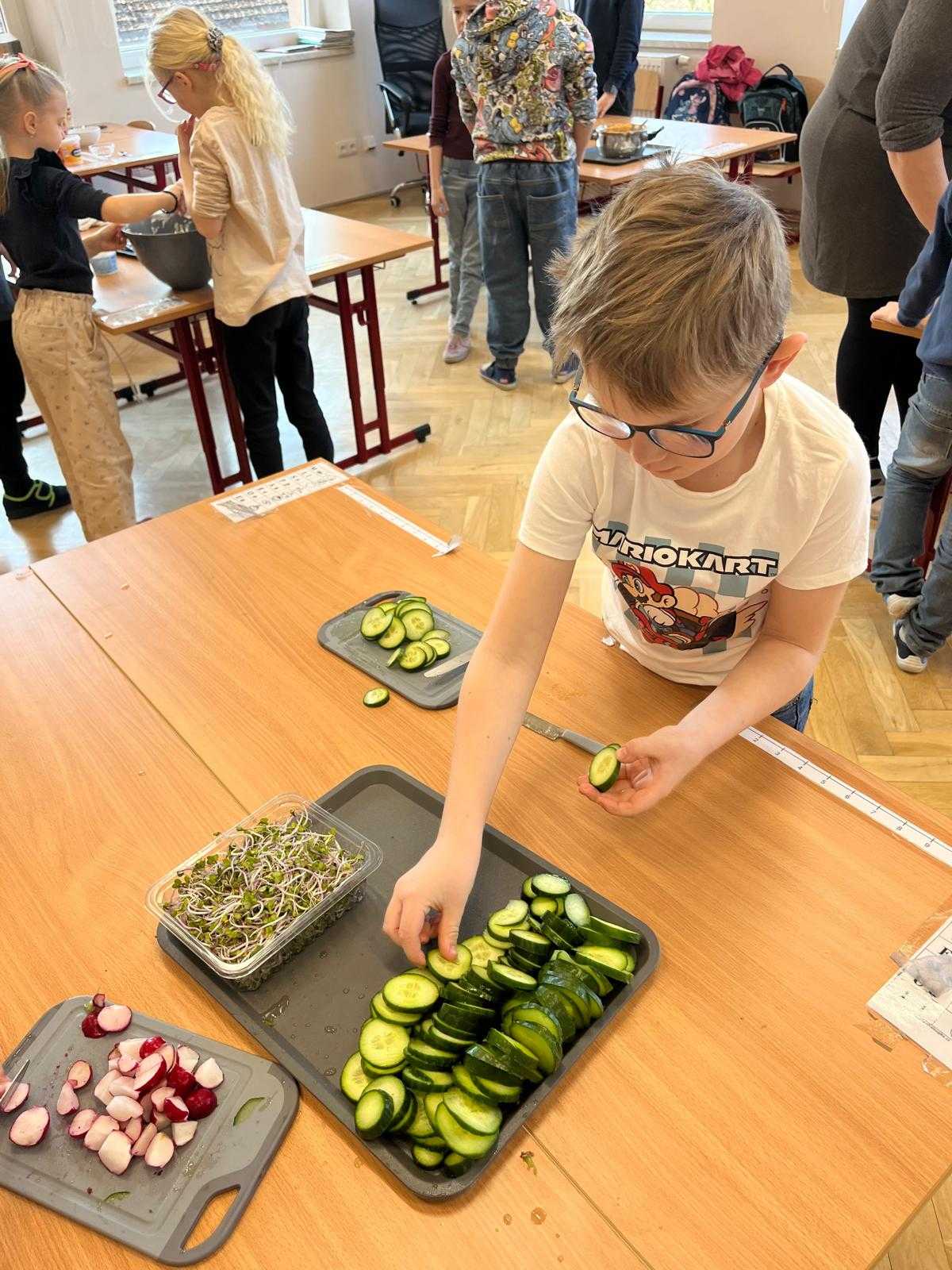 V jednotlivých třídách tomu bylo nejinak. Starší děti si nakoupily suroviny a připravily pro své spolužáky zdravou svačinku. Mladší děti hlavně zdokonalovaly krájecí, loupací a aranžovací dovednosti a připravily si švédské stoly, kde si každý mohl vybrat, co mu chutná.