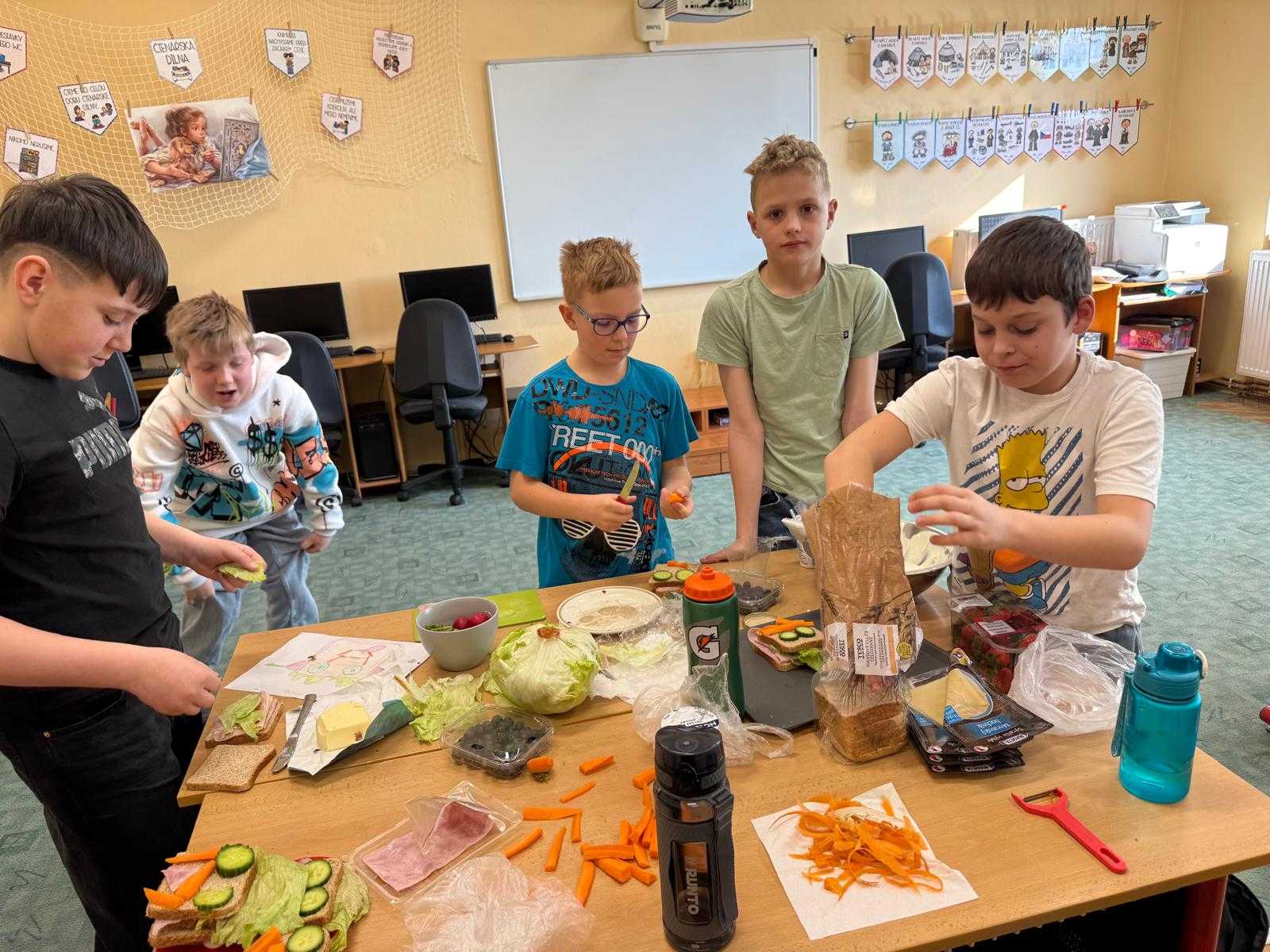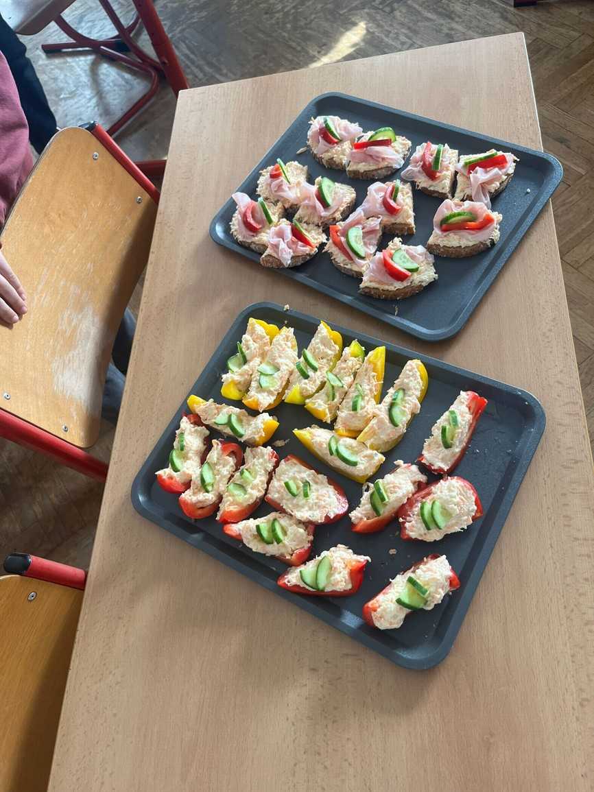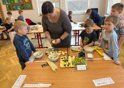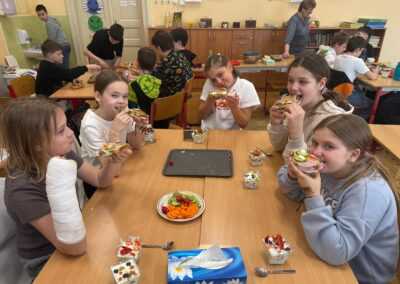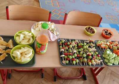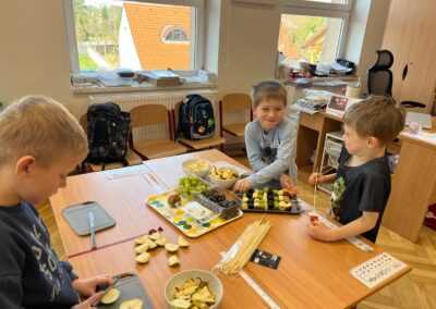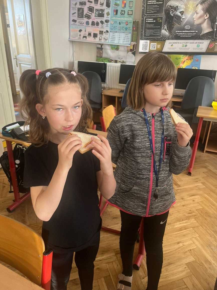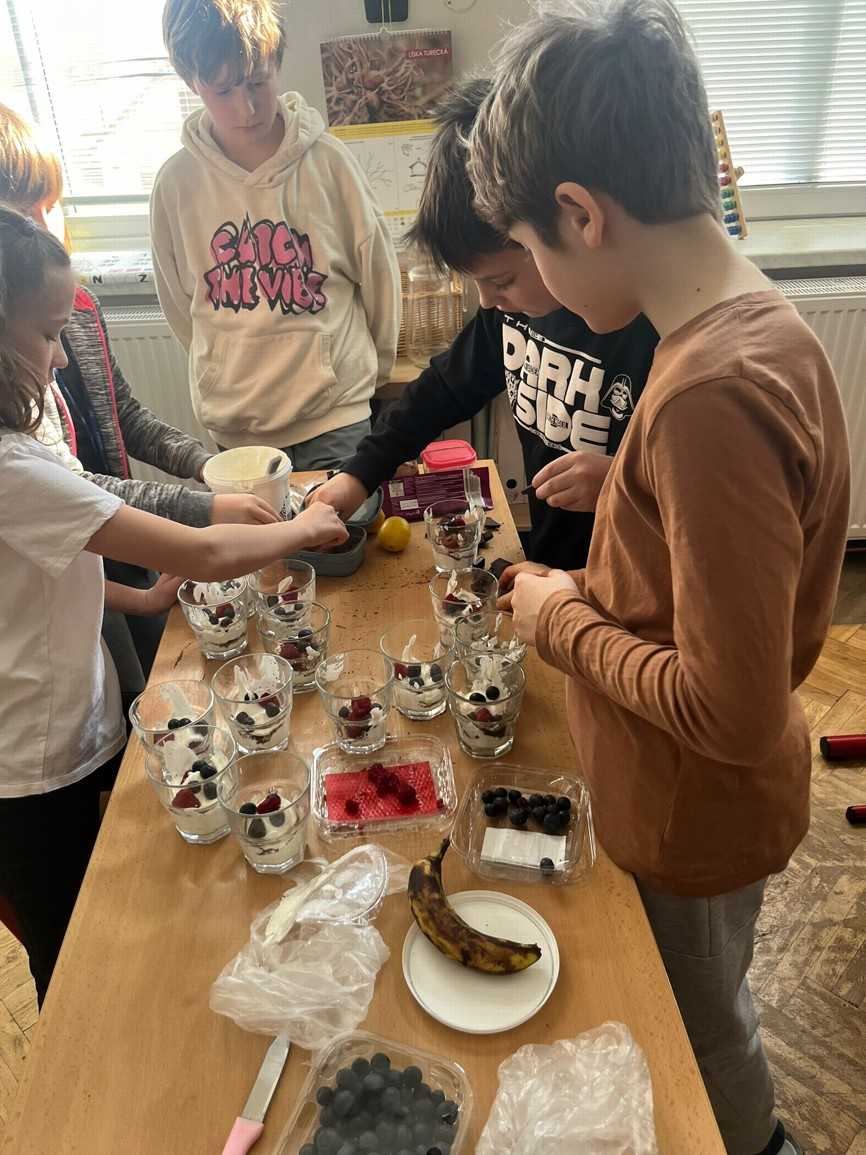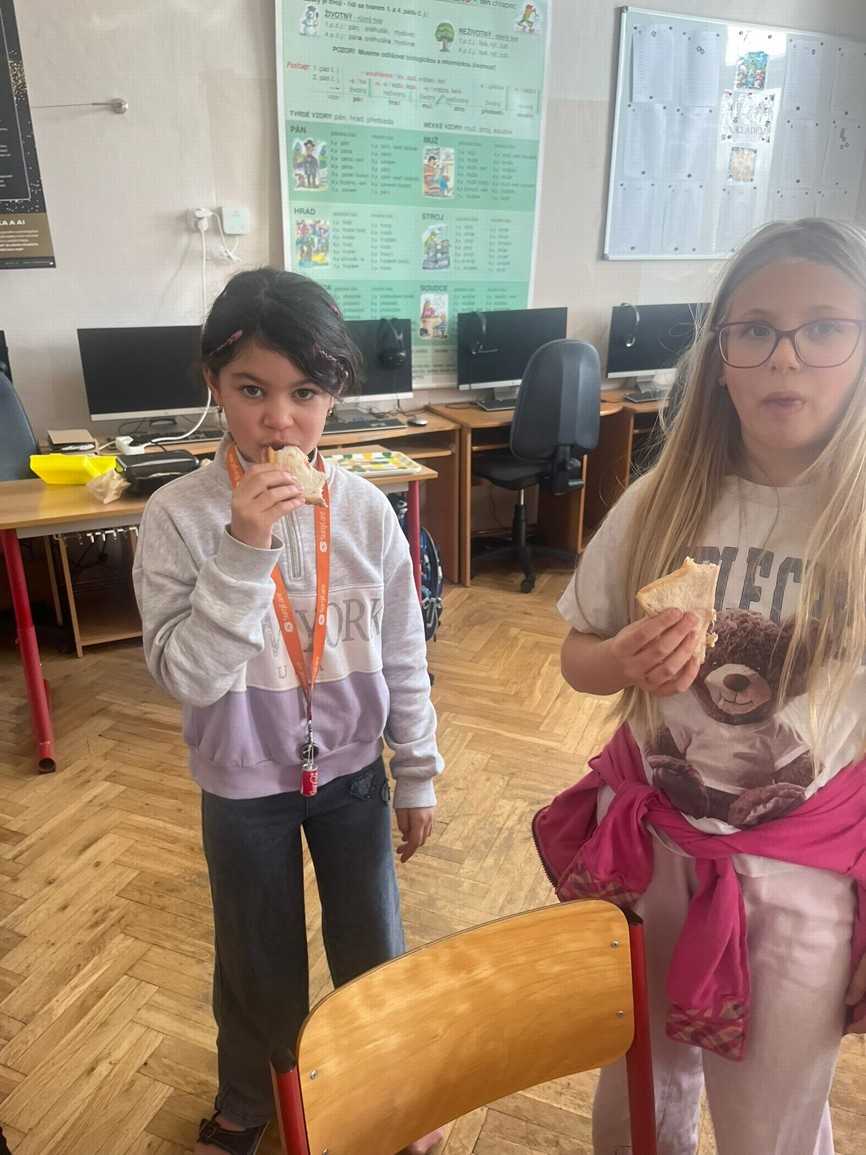 V jednotlivých třídách tomu bylo nejinak. Starší děti si nakoupily suroviny a připravily pro své spolužáky zdravou svačinku. Mladší děti hlavně zdokonalovaly krájecí, loupací a aranžovací dovednosti a připravily si švédské stoly, kde si každý mohl vybrat, co mu chutná.
