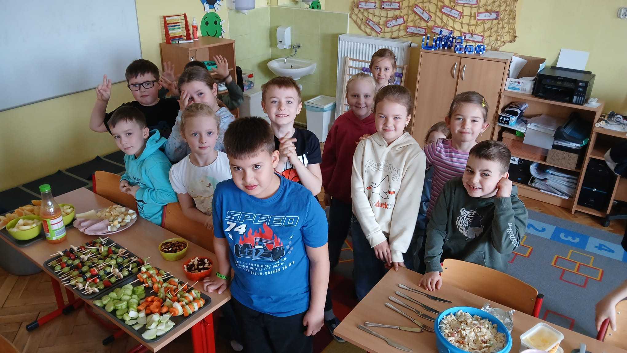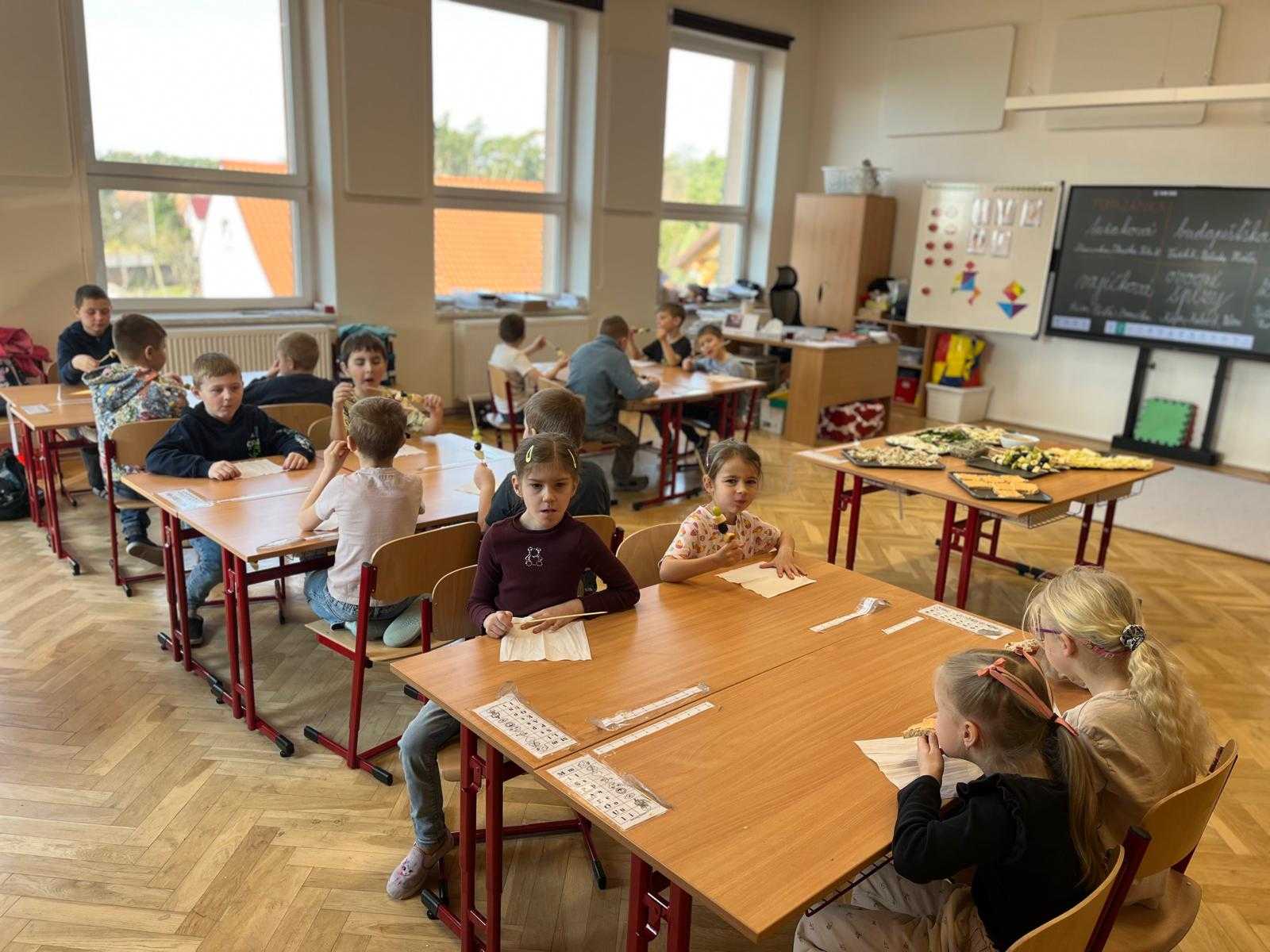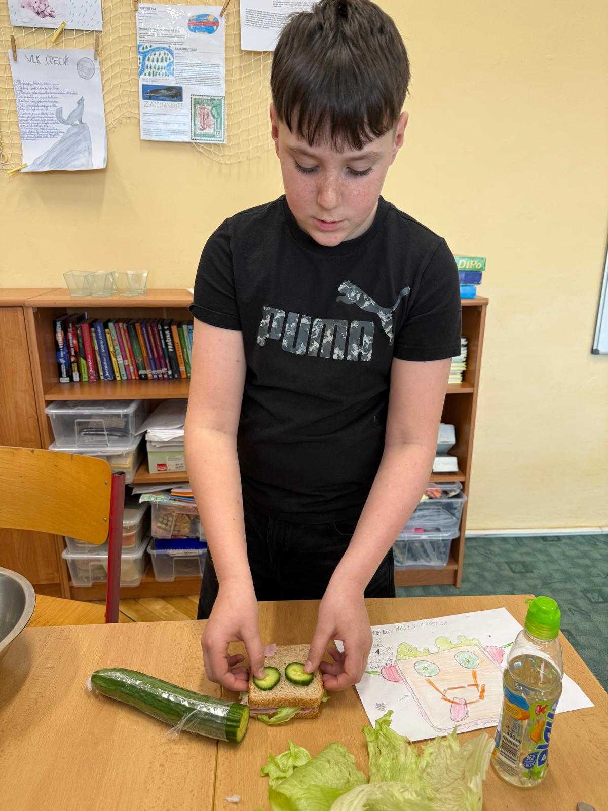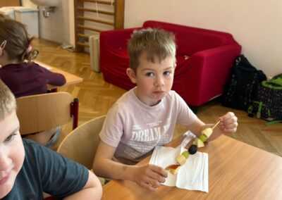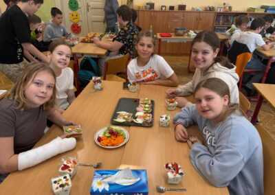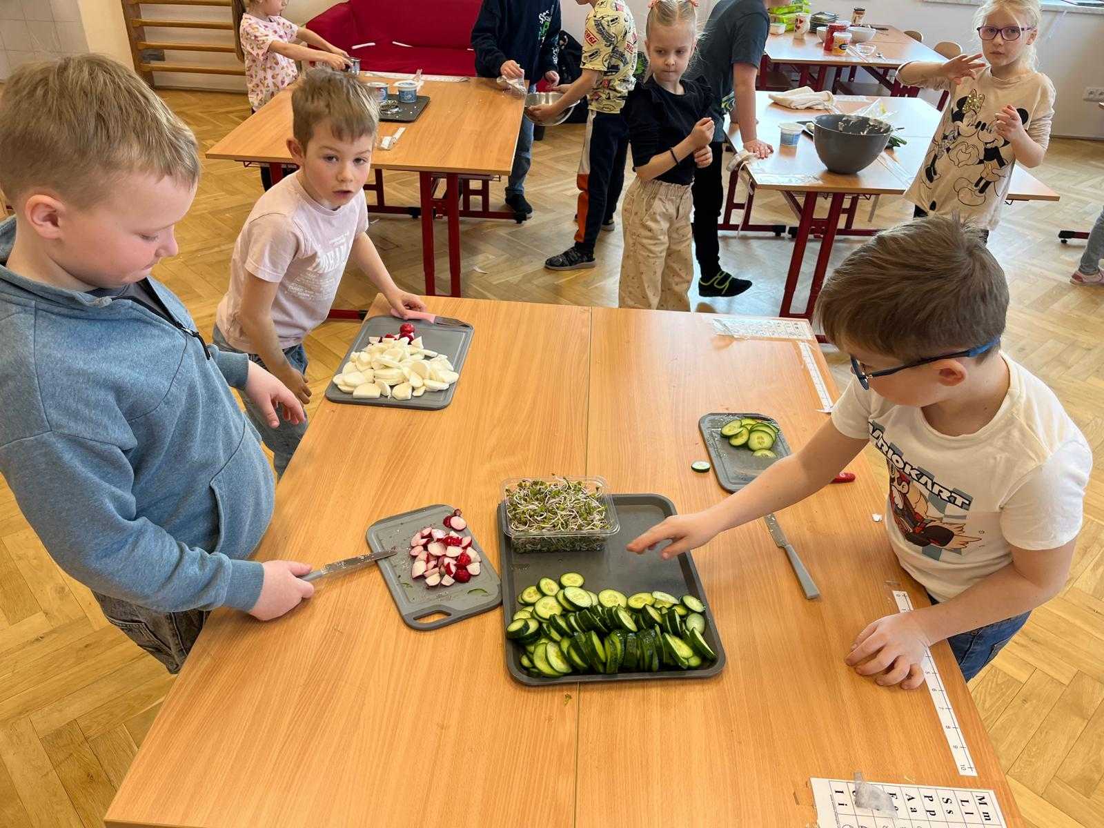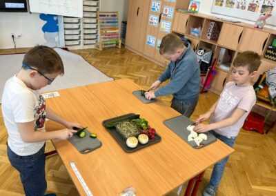 V jednotlivých třídách tomu bylo nejinak. Starší děti si nakoupily suroviny a připravily pro své spolužáky zdravou svačinku. Mladší děti hlavně zdokonalovaly krájecí, loupací a aranžovací dovednosti a připravily si švédské stoly, kde si každý mohl vybrat, co mu chutná.