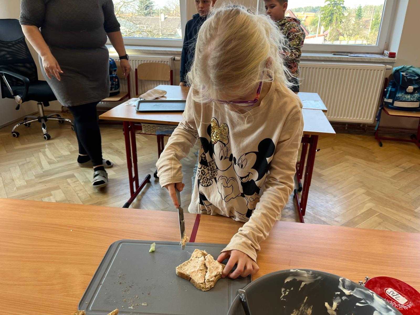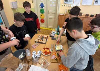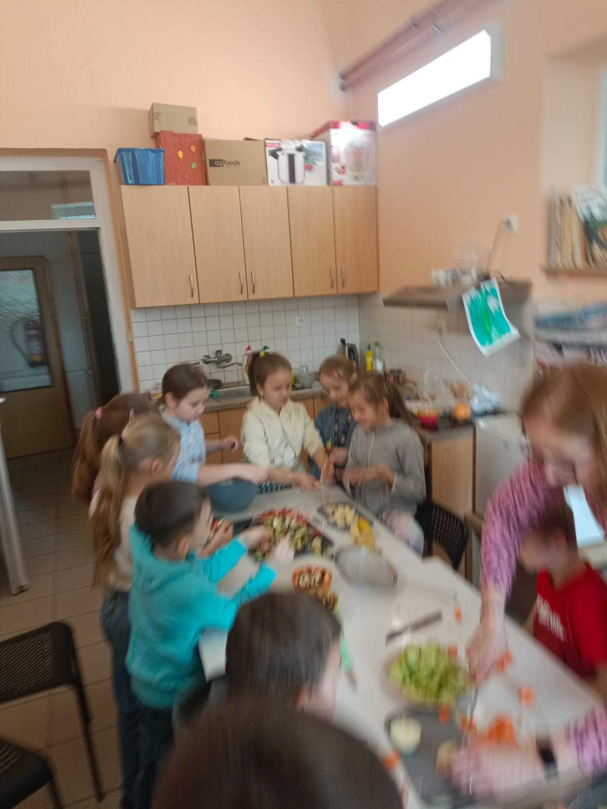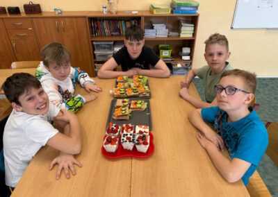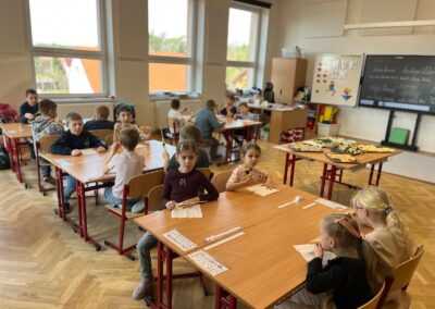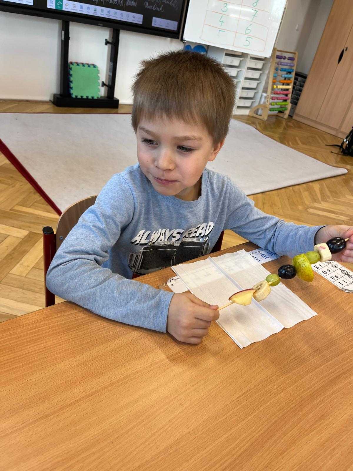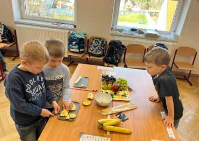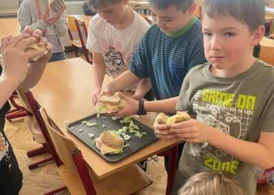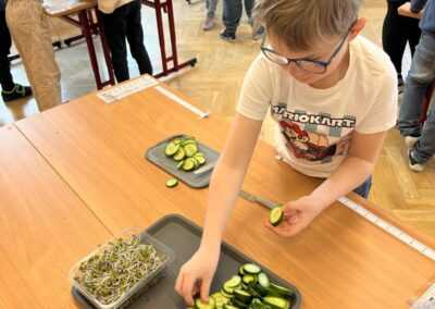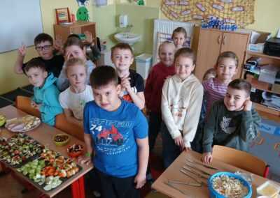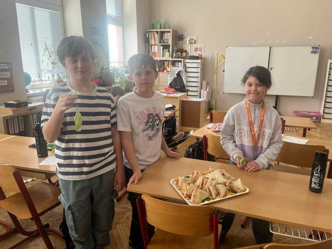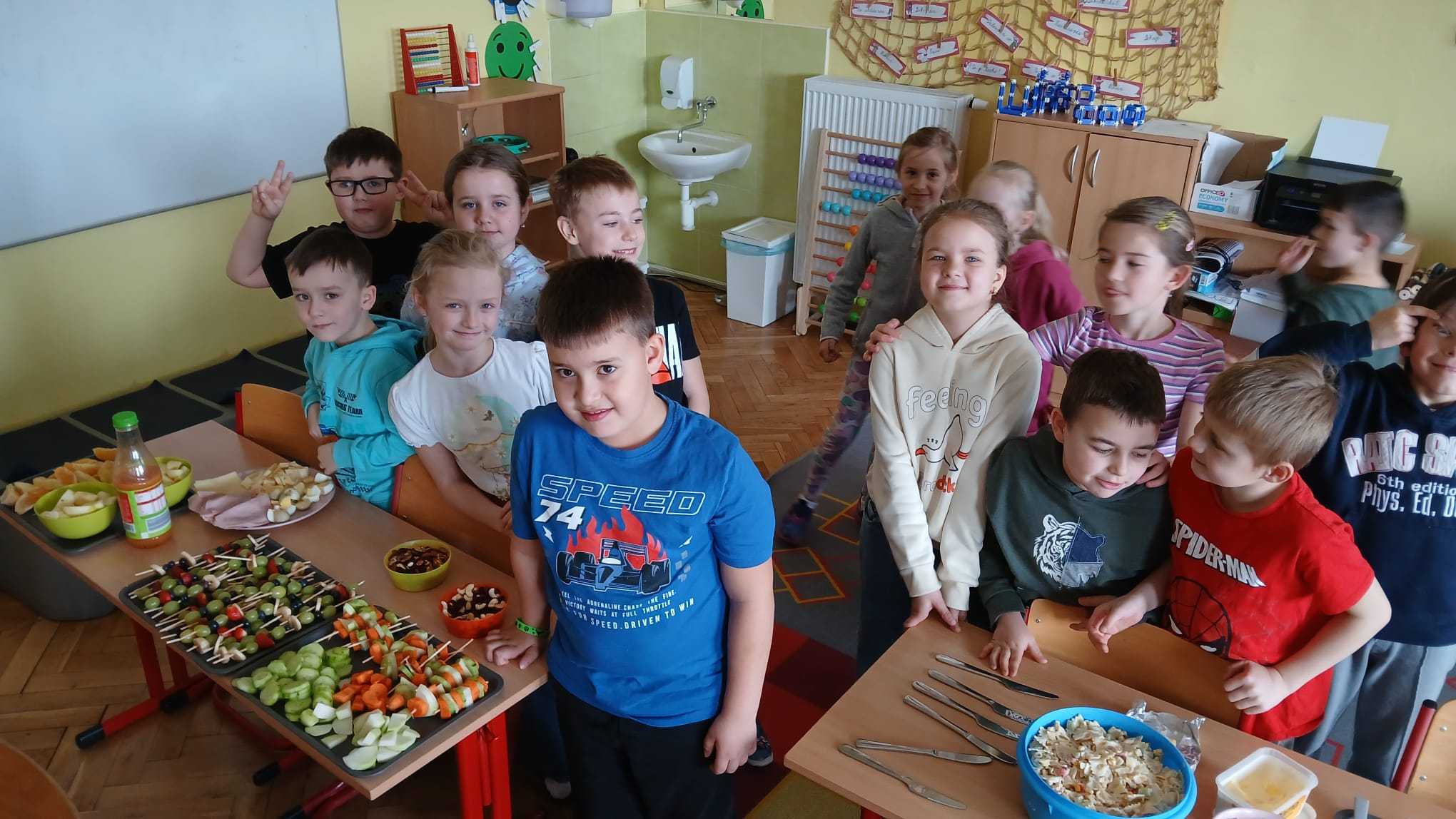 V jednotlivých třídách tomu bylo nejinak. Starší děti si nakoupily suroviny a připravily pro své spolužáky zdravou svačinku. Mladší děti hlavně zdokonalovaly krájecí, loupací a aranžovací dovednosti a připravily si švédské stoly, kde si každý mohl vybrat, co mu chutná.