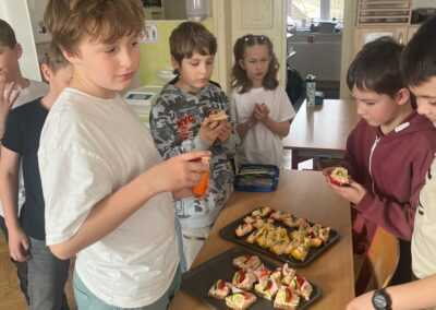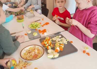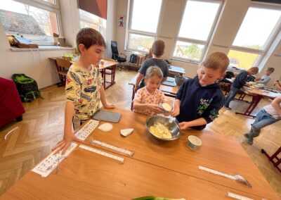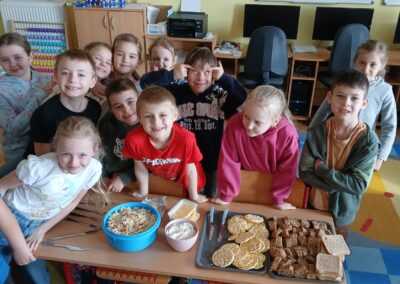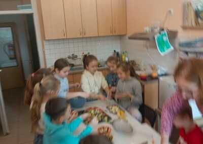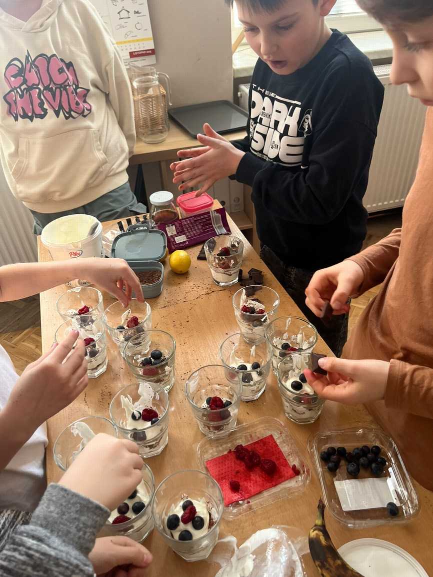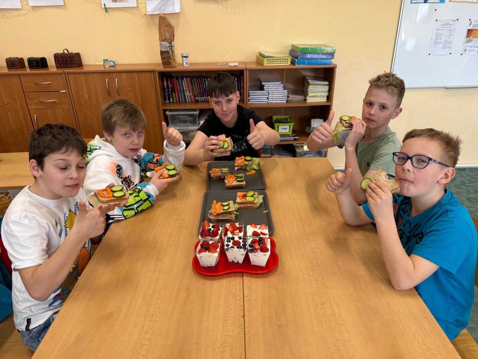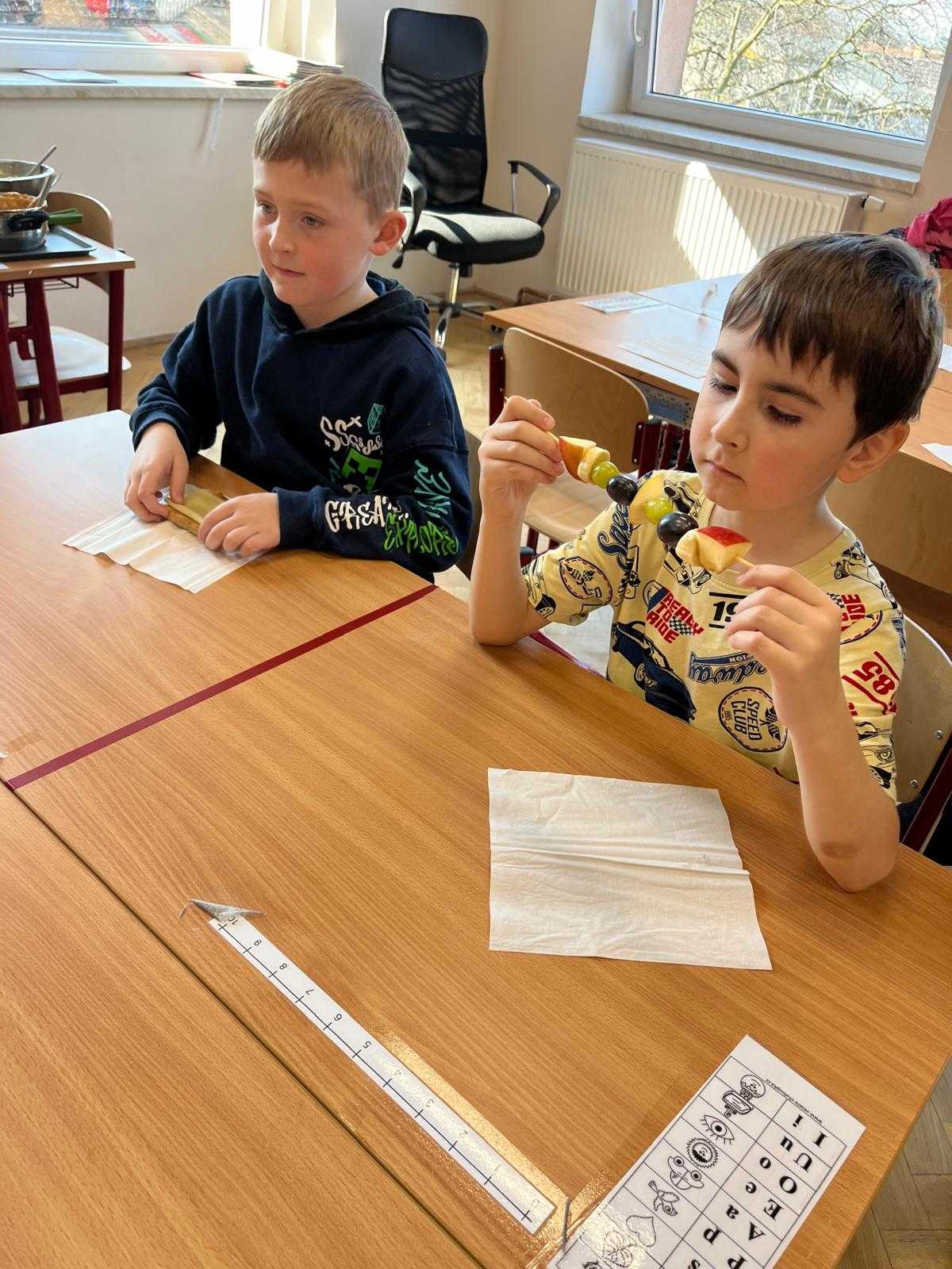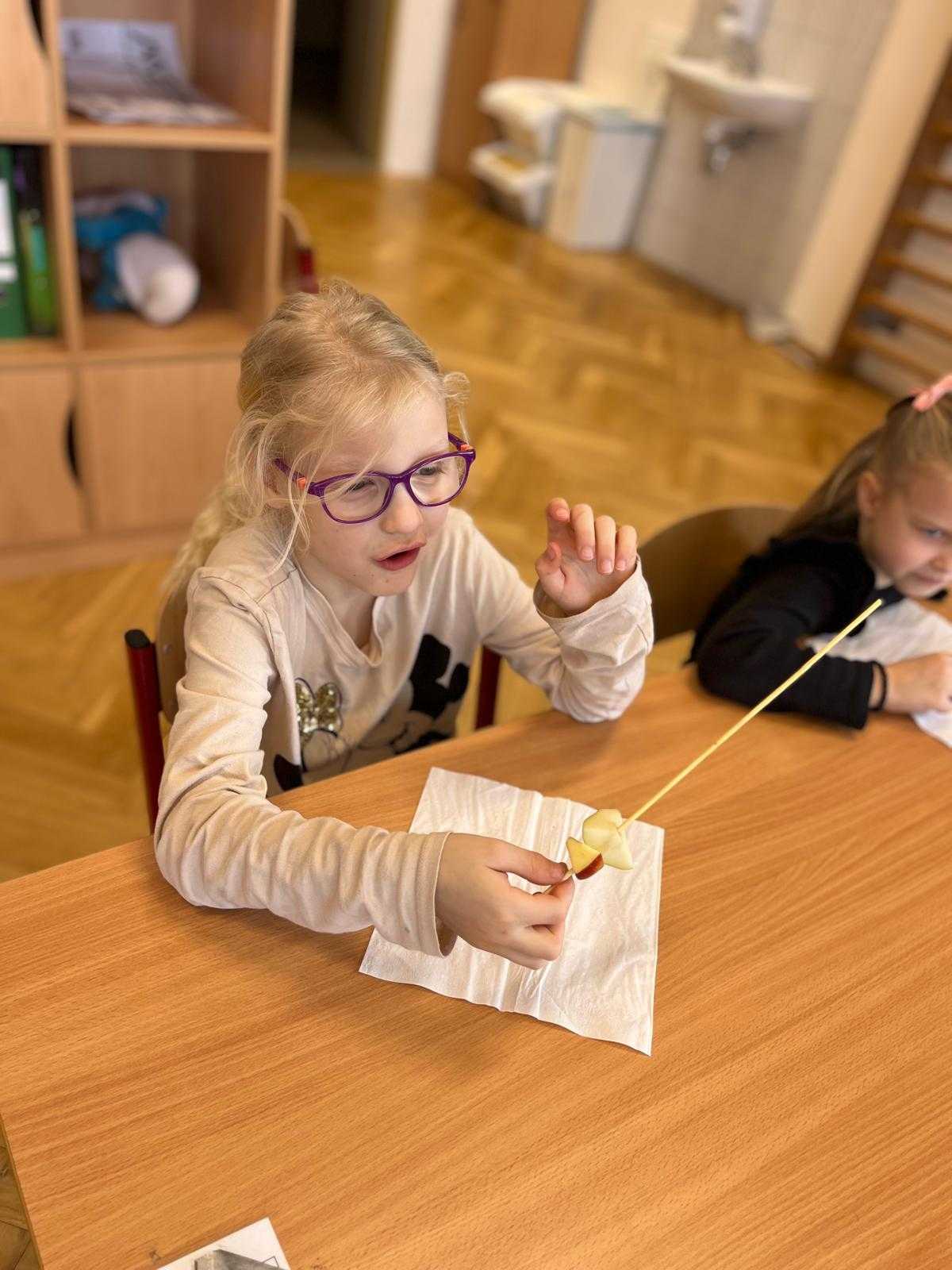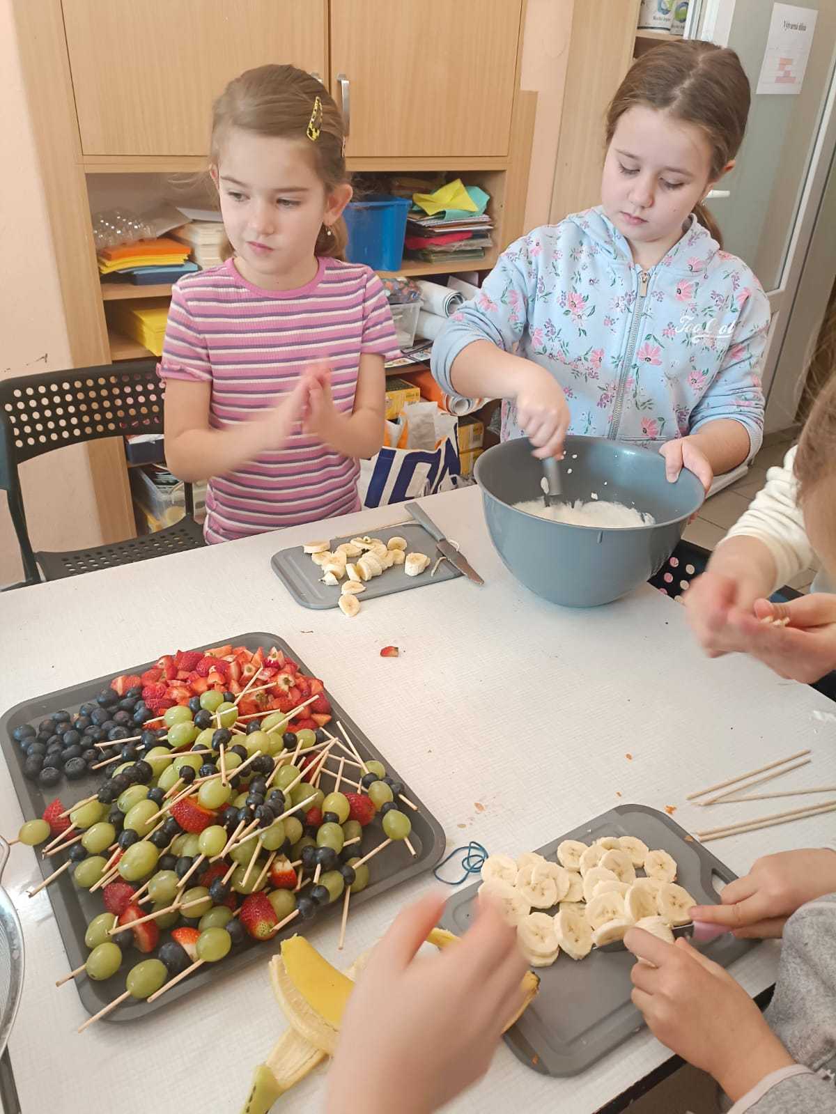 V jednotlivých třídách tomu bylo nejinak. Starší děti si nakoupily suroviny a připravily pro své spolužáky zdravou svačinku. Mladší děti hlavně zdokonalovaly krájecí, loupací a aranžovací dovednosti a připravily si švédské stoly, kde si každý mohl vybrat, co mu chutná.